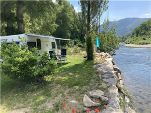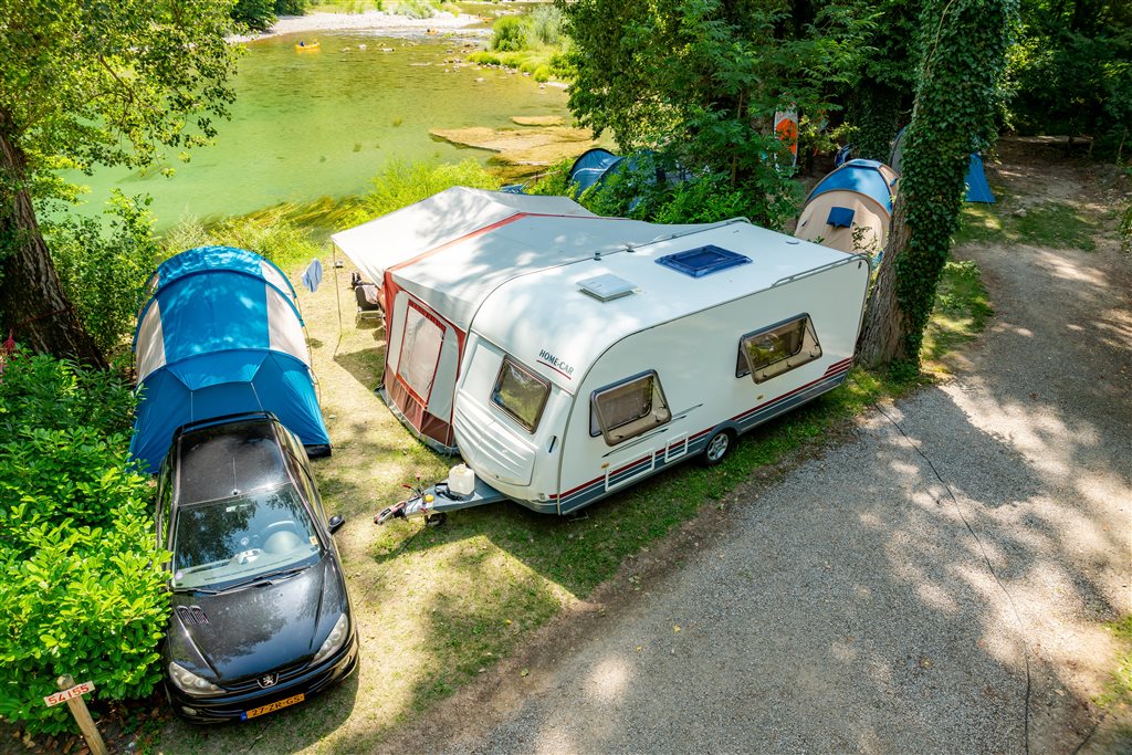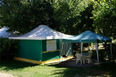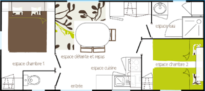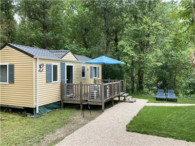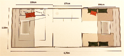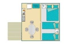 Mobile home measuring 7.80 m x 3 m (23.5 m²) + arbour, 1 double bed (140 x 190 cm), 2 single beds (70 x 190 cm), pull-out sofa bed (130 x 195 cm), 4-ring gas hob, electric coffee maker, microwave oven, kettle, refrigerator, radiator, shower room with separate toilet